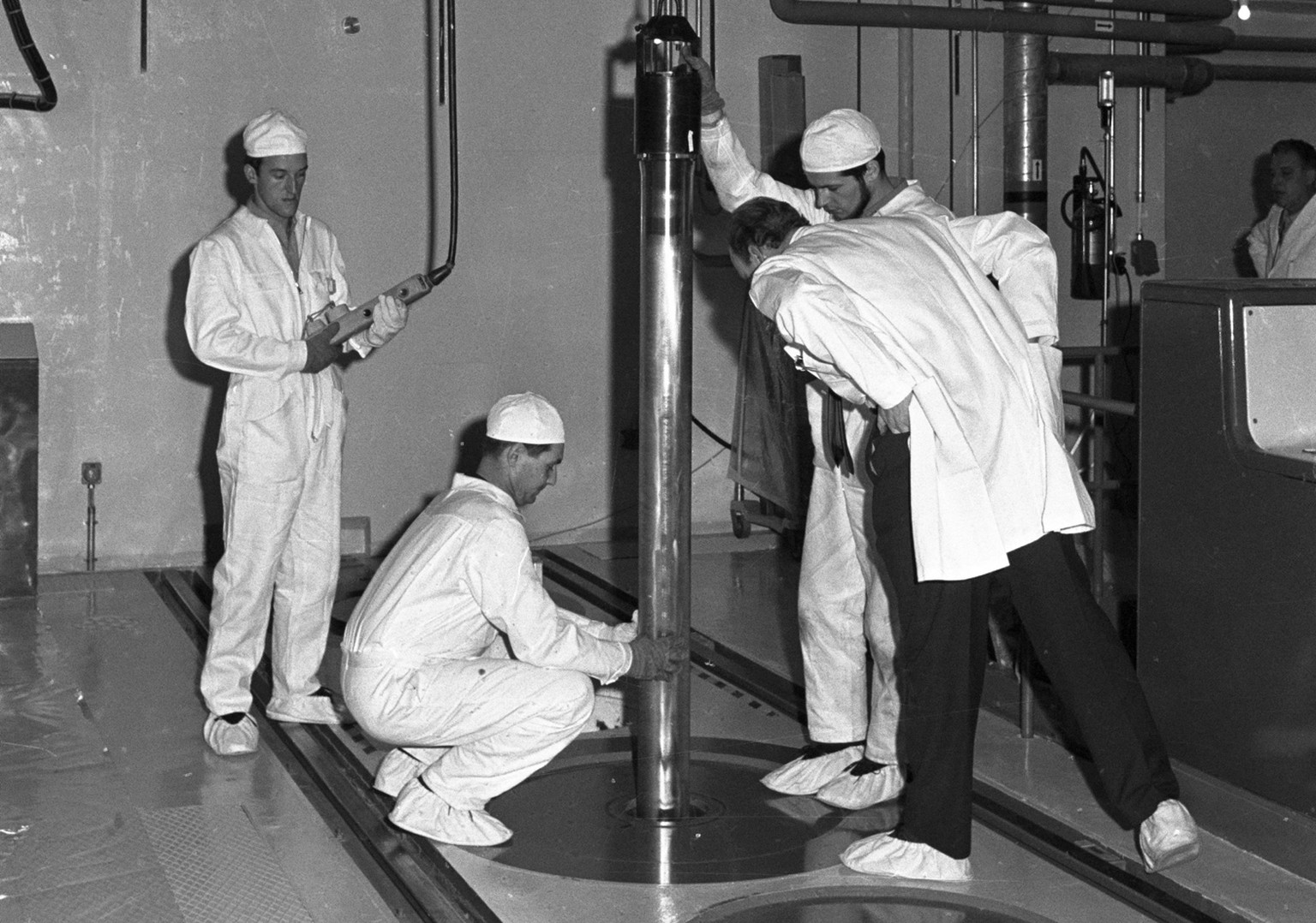 Arbeiter mit Brennstäben im unterirdischen Versuchsatomkraftwerk Lucens im Kanton Waadt, aufgenommen im Dezember 1966.