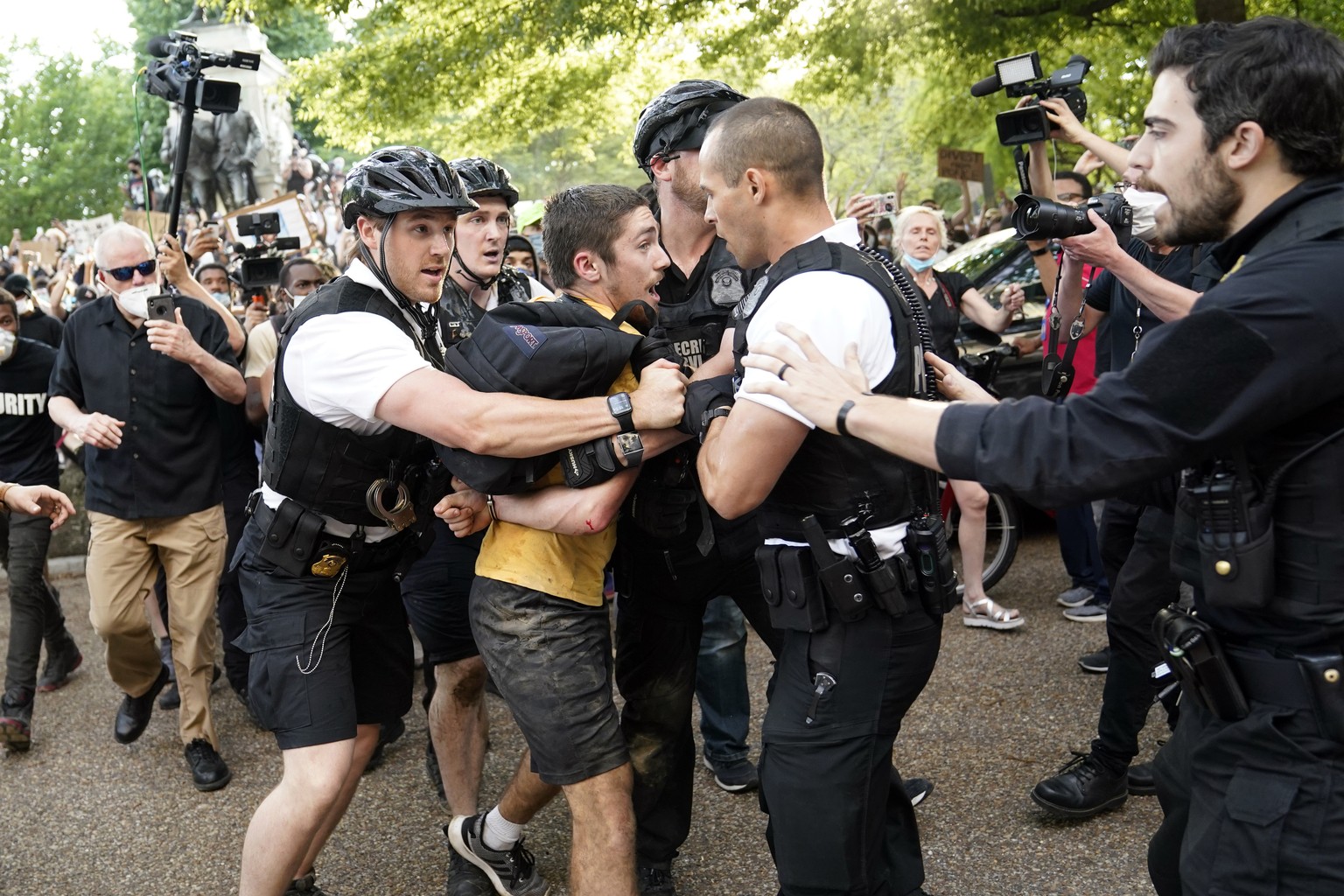 Beamte des Secret Service nehmen vor dem Weissen Haus einen Demonstranten fest.