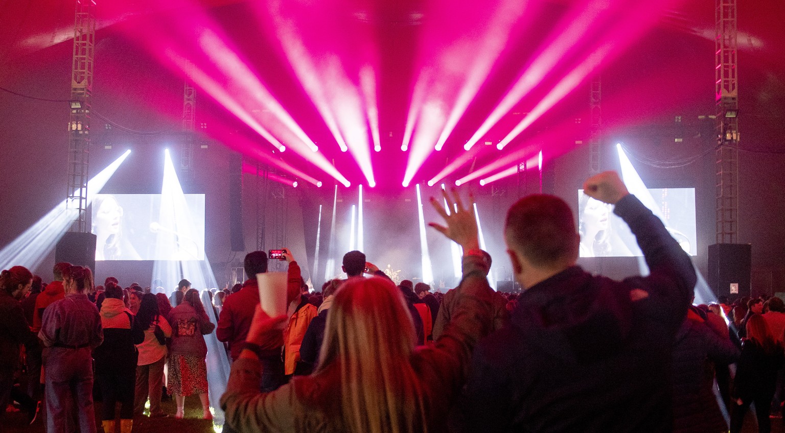 epa09174422 Members of the public participate in a part of a national research programme assessing the risk of the coronavirus disease whilst attending a pilot festival headlined by The Blossoms, without the need to wear a face mask or to social distance in Liverpool, Britain, 02 May 2021. The event is held inside a Big Top tent in Sefton Park with 5000 revellers. EPA/PETER POWELL