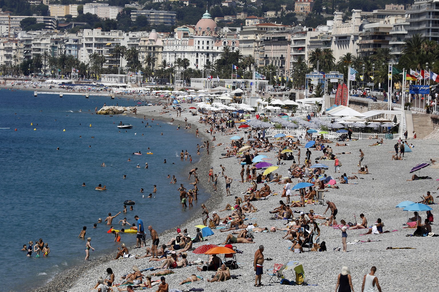 epa08536601 People enjoy the sun and the sea on a beach in Nice, southern France, 09 July 2020. Temperatures reached up to 30 degrees Celsius in Nice. EPA/SEBASTIEN NOGIER