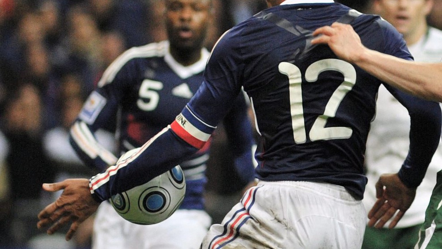 epa01938918 French player William Gallas watches as French captain Thierry Henry appears to control the ball before kicking it to Gallas, who headed a goal from close range, giving France a 1-1 draw in the second leg of their playoff against Ireland at Stade de France, outside paris, France, 18 November 2009. EPA/PHILIPPE LECOEUR / MAXPPP FRANCE OUT --- BELGIUM OUT