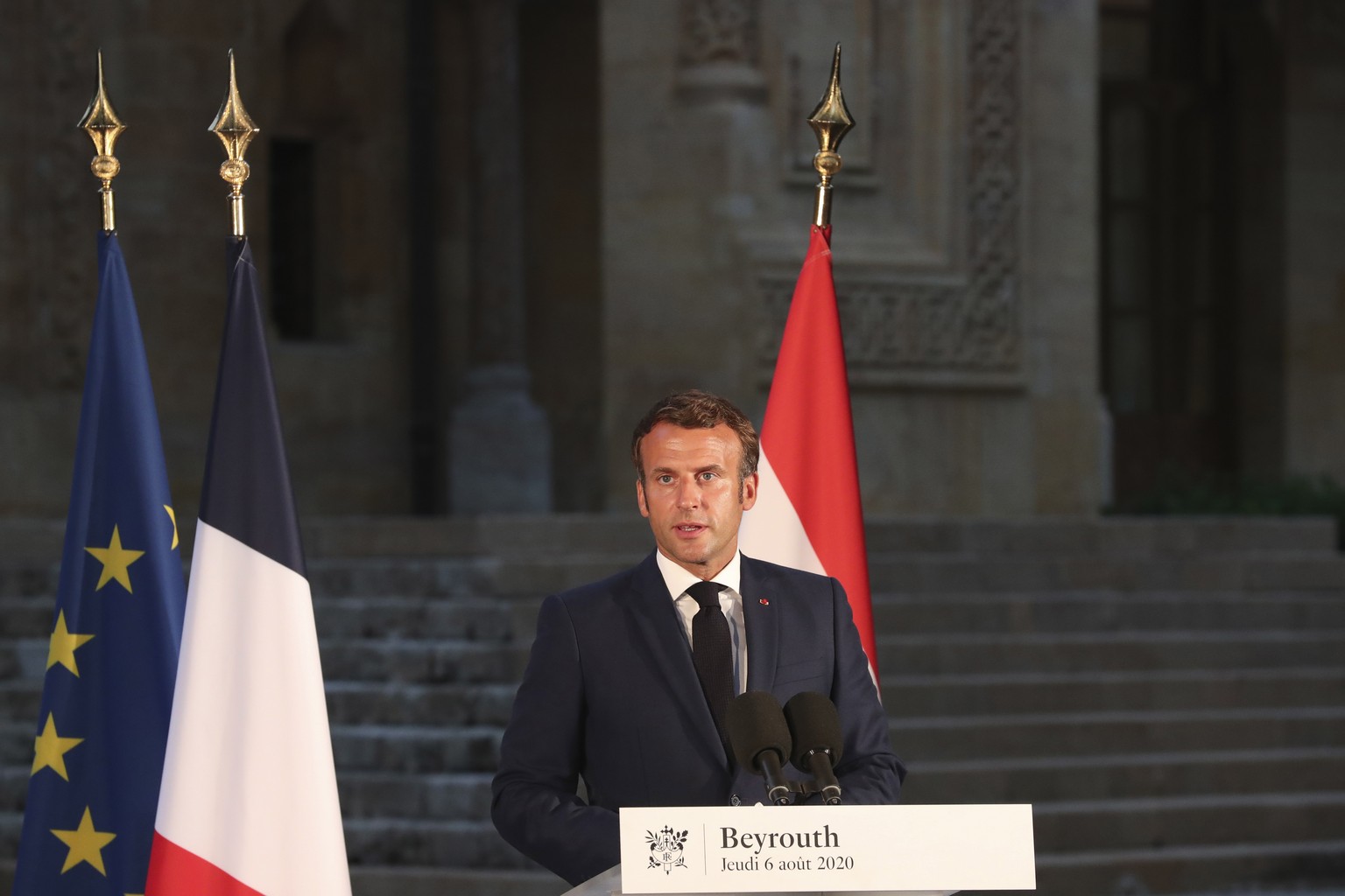 epa08588050 French President Emmanuel Macron delivers his speech during a press conference in Beirut, Lebanon, 06 August 2020. The blast, which killed more than 130 people, wounded thousands and left tens of thousands homeless, is believed to have been caused when a fire touched off a stockpile of 2,750 tons of highly explosive ammonium nitrate. French President Emmanuel Macron announced that France will organize a conference in the next few days with European, American, Middle Eastern and other donors to raise money for food, medicine, housing and other urgent aid. EPA/THIBAULT CAMUS / POOL MAXPPP OUT