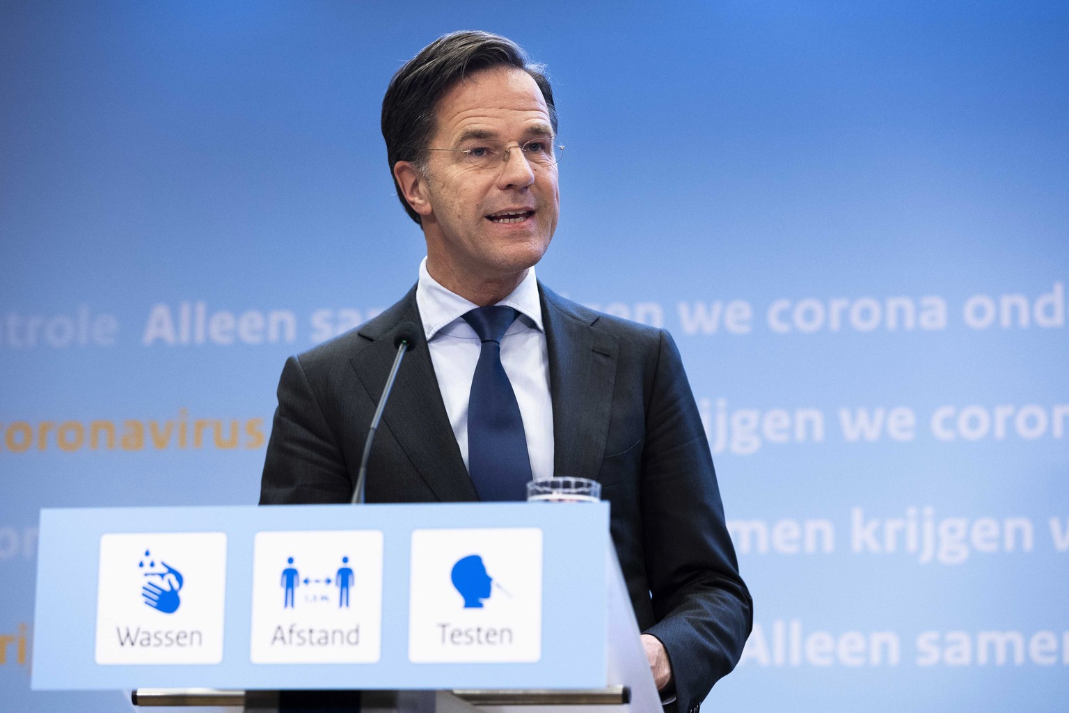 epa09147845 Resigning Prime Minister Mark Rutte explains the corona measures in The Hague, Netherlands, 20 April 2021. The cabinet has come up with a decision on the relaxation of the measures including lifting the night curfew on 28 April, allowing bars and restaurants to operate outdoor terraces and gradually opening universities. EPA/SEM VAN DER WAL