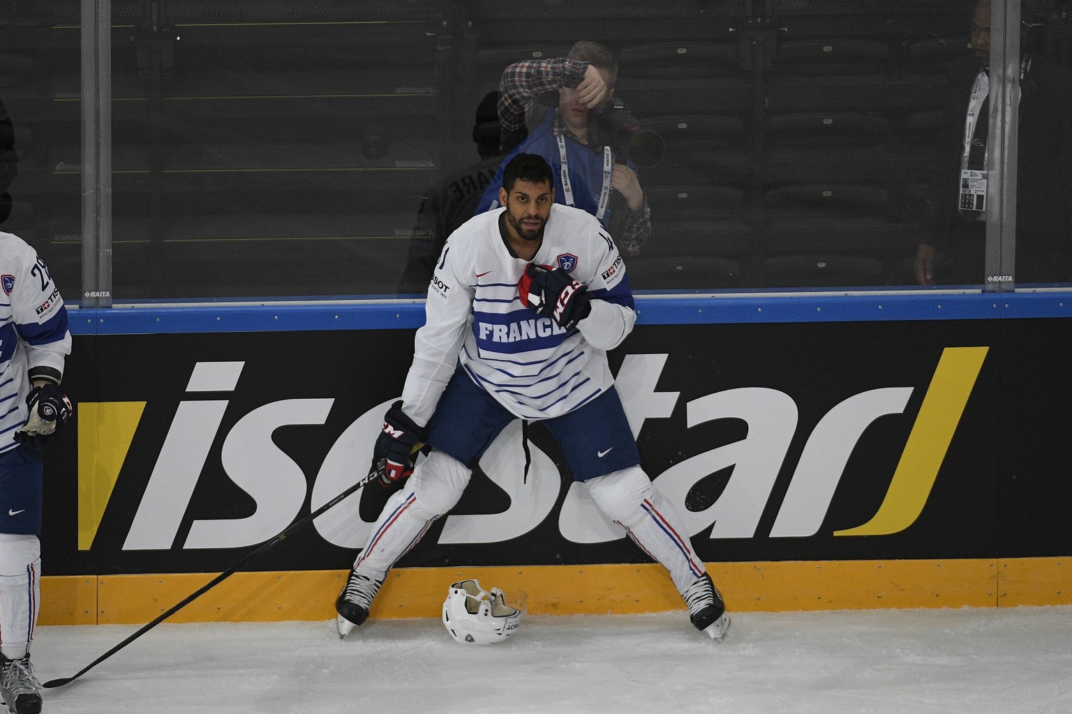 epa05953356 Pierre Edouard Bellemare of France reacts during their Ice Hockey World Championship group B preliminary round match between Switzerland and France in Paris, France on Tuesday, May 9, 2017. EPA/HERVE RANCHIN