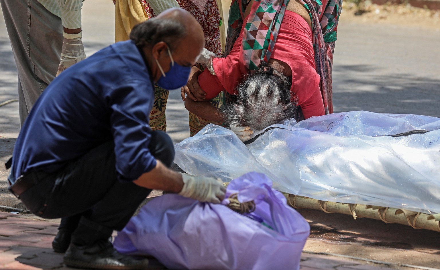 epa09191398 People mourn while they perform the last rites for their relatives who died with Covid-19 during their funeral at a cremation ground in Ahmedabad, India, 11 May 2021. Calls for Prime Minister Narendra Modi to enforce a nationwide lockdown have been growing as India struggles in the grip of an unprecedented health crisis amid COVID-19 pandemic and vaccine shortages. EPA/DIVYAKANT SOLANKI