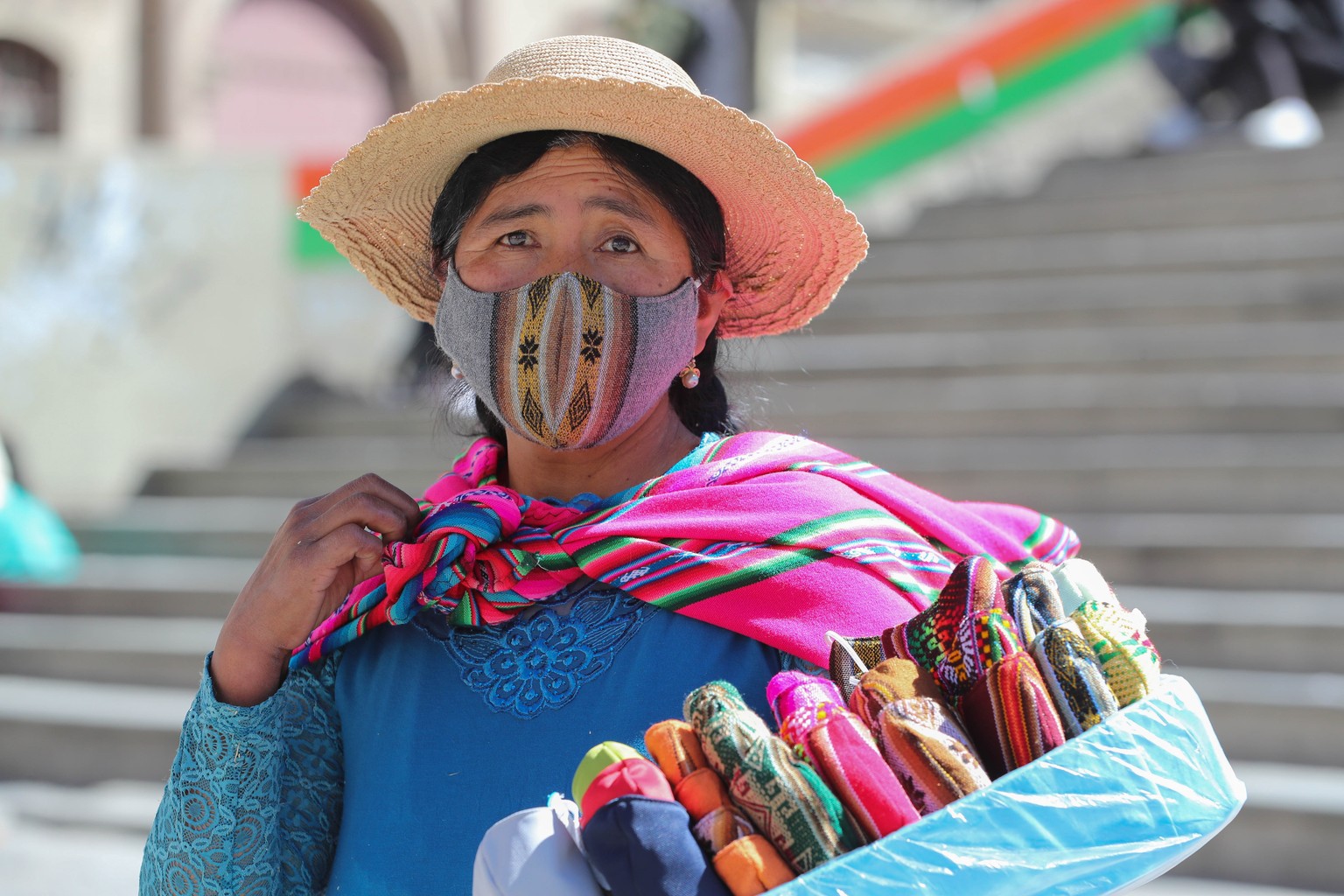 epa08496644 An Aymara woman sells face masks during a quarantine decreed due to the COVID-19 pandemic at a central square in La Paz, Bolivia, 19 June 2020. The Aymara, aka Aimara are an indigenous nation in the Andes regions. EPA/Martin Alipaz