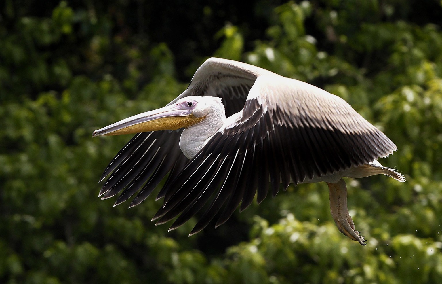 epa04739906 A Rosy Pelican takes off in Delhi zoological park on the occasion of world migratory bird day in New Delhi, India, 09 May 2015. Many Rosy Pelicans settled down in fresh water lakes with plenty of fish provided to them at the park but mostly rosy Pelicans migrate to India in the winter season as there are enough fish at the winter time in water lakes around the country. World Migratory Bird Day is awareness campaign for the migratory bird that annually held on the second weekend of May. EPA/HARISH TYAGI