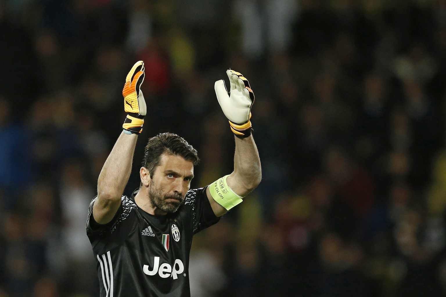 epa05942634 Juventus goalkeeper Gianluigi Buffon reacts during the UEFA Champions League semi final, first leg soccer match between AS Monaco and Juventus at Stade Louis II in Monaco, 03 May 2017. EPA/GUILLAUME HORCAJUELO