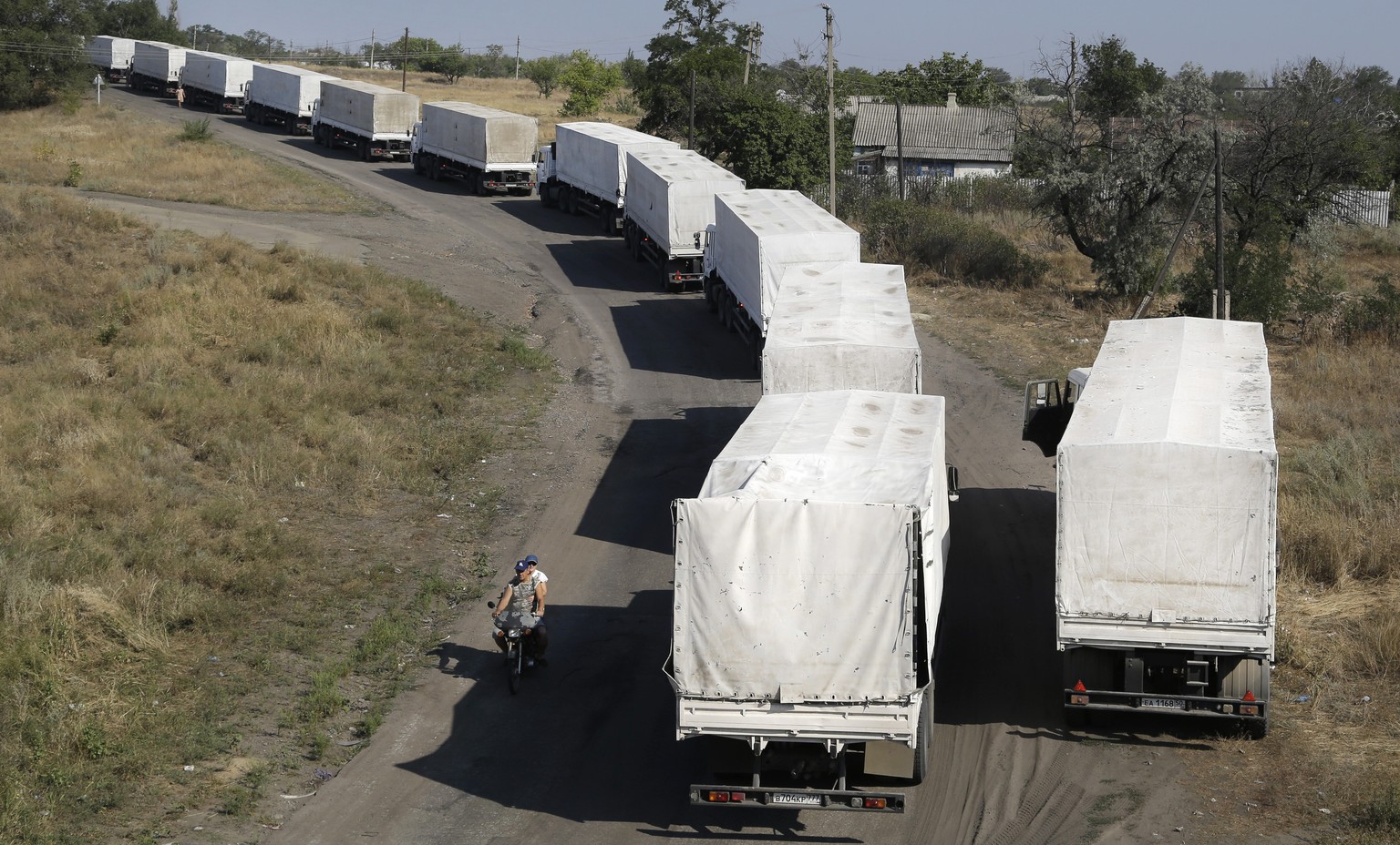 Russland hatte am Freitagvormittag den seit Tagen an der Grenze wartenden Hilfskonvoi für die notleidende Bevölkerung in der Ostukraine ohne das Einverständnis Kiews und des Roten Kreuzes nach Lugansk geschickt. Nach Angaben von Beobachtern der Organisation für Sicherheit und Zusammenarbeit in Europa (OSZE) fuhren 227 Laster in sechs Gruppen über die Grenze.