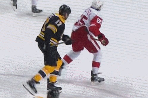 Red-Wings-Stürmer fährt am Tor vorbei, trifft aber trotzdem aus fast unmöglichem Winkel