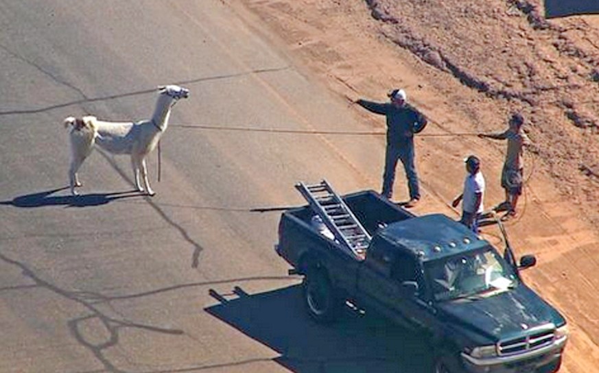 Einen schwarzen und einen weissen Ausbrecher hat die US-Polizei am Donnerstag in der Stadt Sun City im US-Bundesstaat Arizona gejagt. Vor laufender Kamera konnten die Behörden die zwei flüchtigen Lamas schliesslich einfangen.