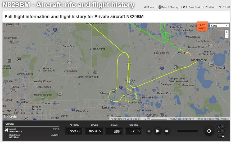 Das zweisitzige Light Sport Aircraft vom Typ RV12 startete um 22:43 Uhr (mitteleuropäische Zeit) von der Stadt Kissimmee in Richtung Polk City, um dann über Lakeland den wahrscheinlich grössten Penis der Welt zu fliegen. Danach flog der Privatpilot Richtung Westküste. Gegen ein Uhr landete er wieder in Kissimme. Zuvor scheint der Witzbold allerdings versucht zu haben – so es lässt wenigstens die Animation erahnen – sein Kunststückchen über Oakland zu wiederholen. Was dabei heraus kam, wünscht man aber keinem: