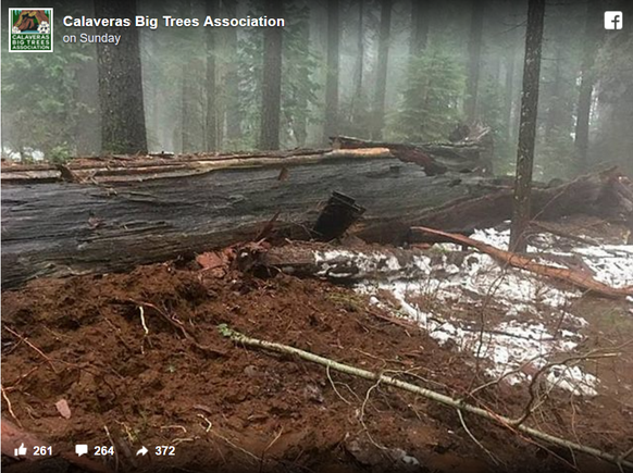 Durch ein Unwetter hat der kalifornische Calaveras-Park südöstlich von Sacramento sein Wahrzeichen verloren: Ein vermutlich mehr als tausend Jahre alter Baum wurde entwurzelt, als es am Wochenende stark stürmte.