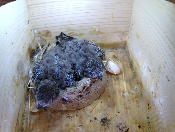 Besonders am Anfang der Saison, bevor die Eier gelegt werden, verbringen die Eltern noch viel Zeit ausserhalb des Nistkastens. Da die Vögel über Jahre am gleichen Ort brüten, bauen sie auch jede Saison an ihrem Nest weiter und holen entsprechendes Material von draussen.