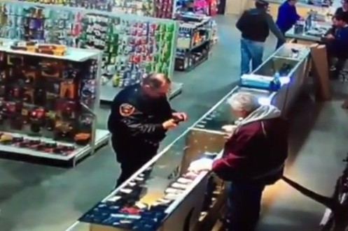 Hier schiesst sich ein Cop im Waffenladen als erstes mal den Finger weg