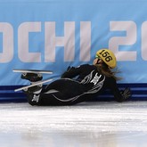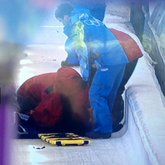 Indischer Rodler liegt benommen neben dem Schlitten, bis dieser ihn wieder auflädt und er die Fahrt beenden kann