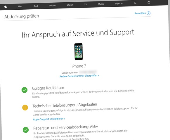 - Ob man Anspruch auf unentgeltliche Service-Leistungen und Support hat, kann man mithilfe der Geräte-Seriennummer auf dieser Apple-Webseite herausfinden.