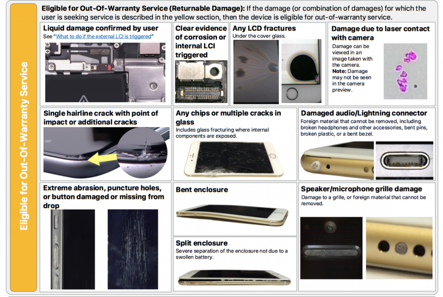 Apple spricht von «Out-of-warranty Service», das sind kostenpflichtige Reparaturen, die nicht durch die gesetzlich vorgeschriebene Gewährleistungspflicht, die Hersteller-Garantie oder die Zusatz-Versicherung «AppleCare+» gedeckt sind (wobei dabei auch Kosten anfallen können, siehe unten).