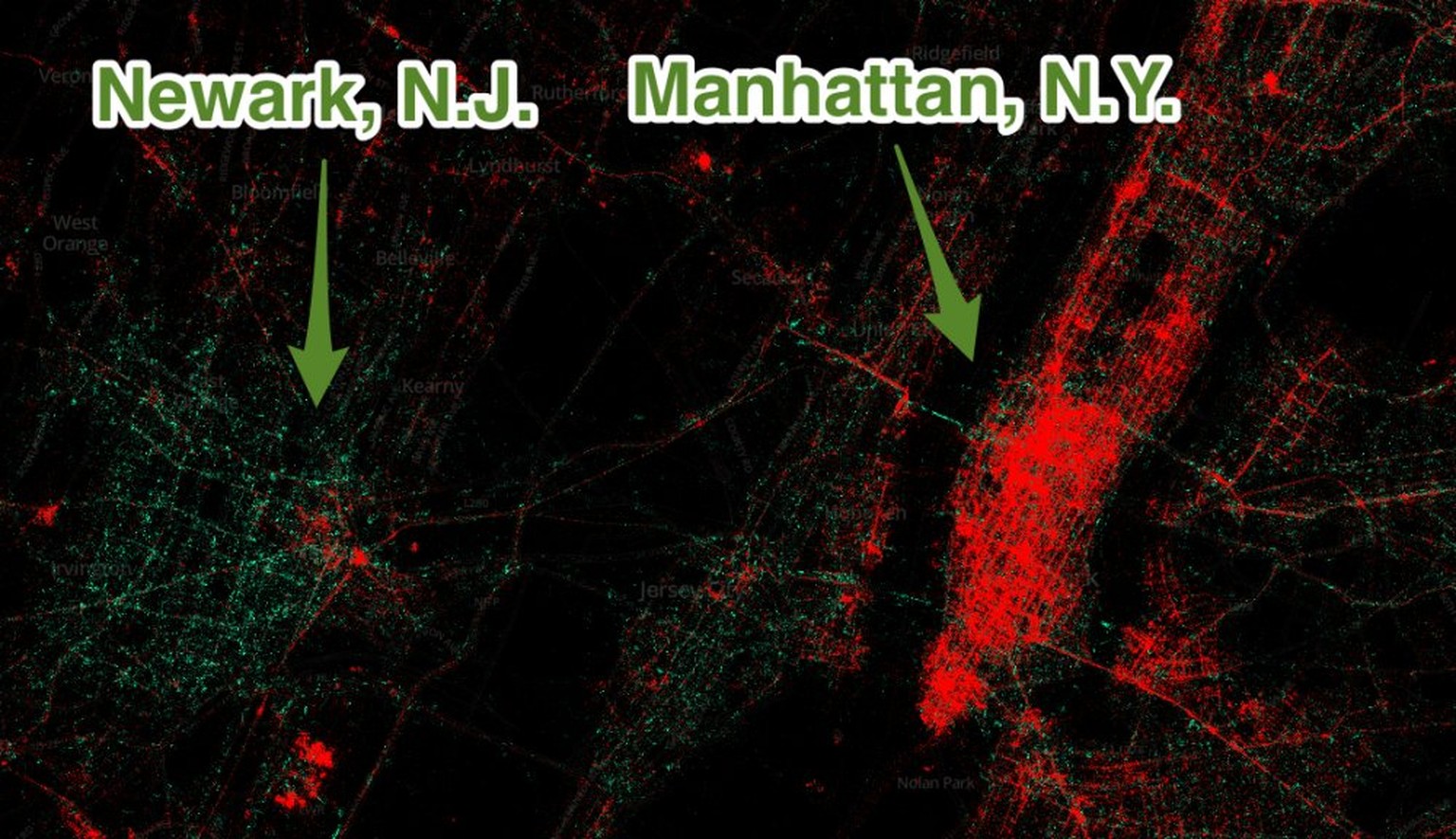 280 Millionen winzig kleine Punkte über die ganze Welt verteilt: Sie repräsentieren Tweets, farblich geordnet nach dem benutzten Gerät. Das Rot der iPhones sticht trotz weltweiter Android-Dominanz klar ins Auge. Dabei scheint sich auch die Schere zwischen Arm und Reich bemerkbar zu machen. Am deutlichsten fällt dies anhand des Beispiels von New York auf. Das wohlhabende Manhattan ist ein einziger roter Fleck, während das ärmere Newark einen klaren Grünstich von Android-Geräten aufweist.