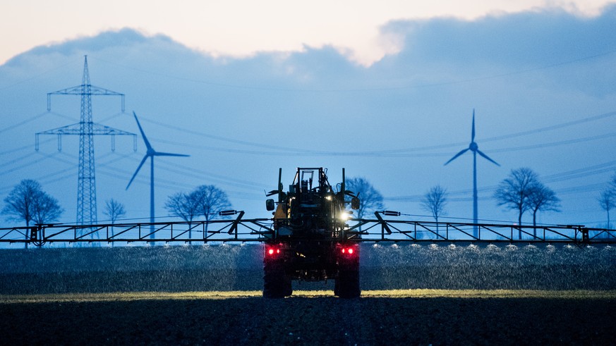 23.02.2018, Niedersachsen, Algermissen: Ein Landwirt duengt in der Morgendaemmerung bei Temperaturen um den Gefrierpunkt ein Feld im Landkreis Hildesheim mit Stickstoffduenger. Der Frost sorgt dafür,  ...