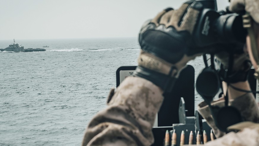 Ein US-Soldat beobachtet ein iranisches Schiff in der Strasse von Hormus. (Foto: US MARINE CORPS/STAFF SGT. DONALD HOLBERT via EPA Keystone)