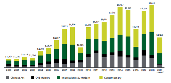 - 2019 erreichte der weltweite Verkauf von Kunst und Antiquitäten einen geschätzten Wert von 64,1 Mrd. US-Dollar (-5% ggü. Vorjahr). 82% der Umsätze stammten aus den USA (44%), Grossbritannien (20%) und China (18%). Die Schweiz machte ca. 2% des globalen Marktes aus.