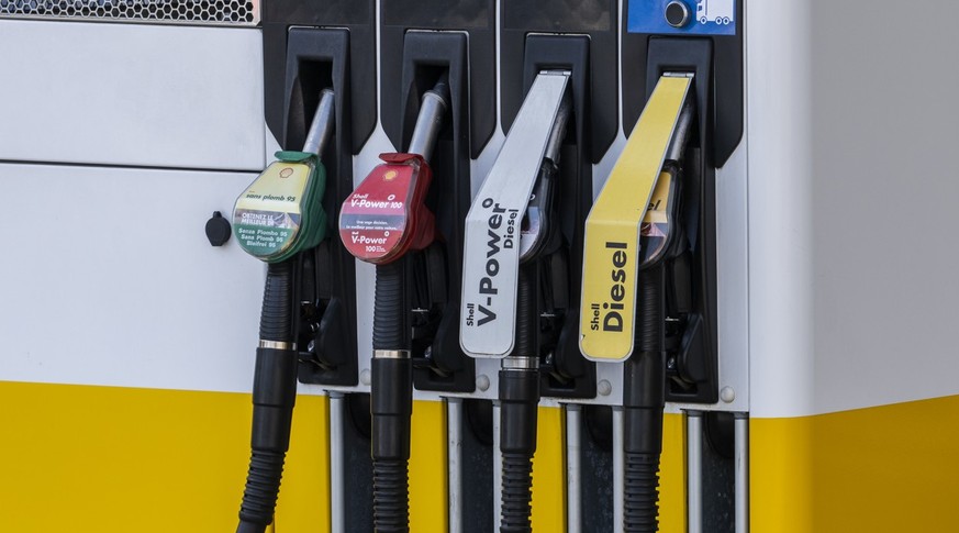 Des pistolets de distribution pour station d'essence sont photographies dans une station-service Shell, ce jeudi 10 mars 2022 a Geneve. Les prix de l'essence sont a un niveau sans precedent, ...
