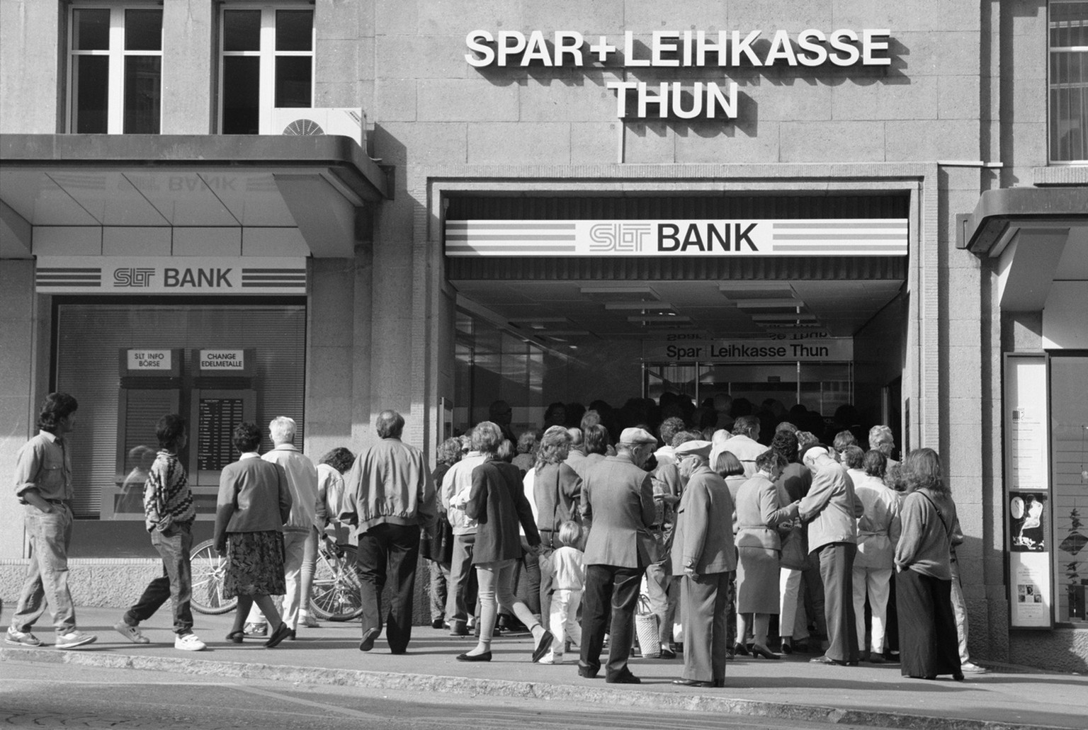 Die Auswirkungen beschränkten sich im Gegensatz zu heute – vorerst – auf die Region Thun, doch schon damals löste der Crash globale Schockwellen aus. Eine Schweizer Bank, die pleite ging? Fernsehteams aus aller Welt kamen nach Thun und filmten die verzweifelten Sparer, die sich vor dem Sitz der SLT versammelten und um ihr Geld bangten.