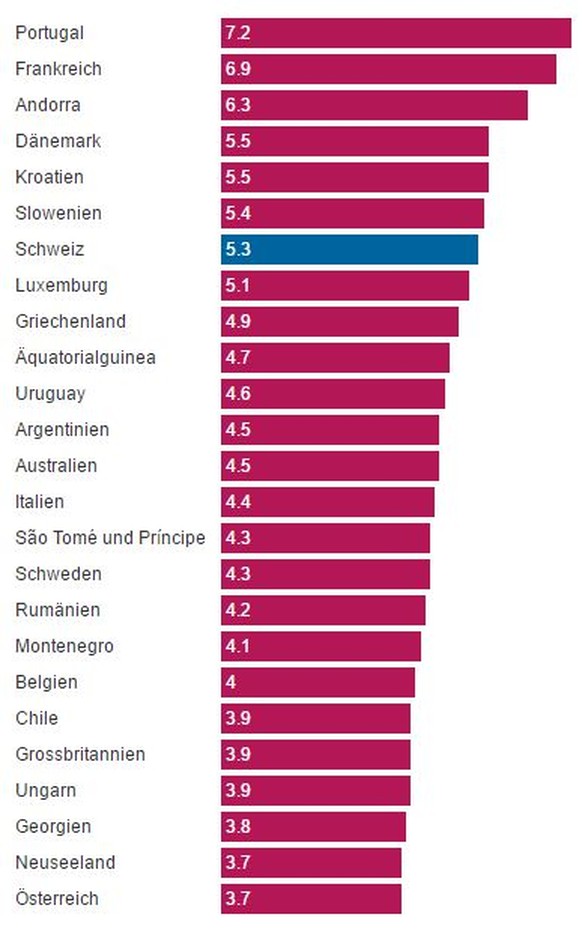 Beim Wein nehmen dagegen wieder europäische Länder die Spitzenplätze ein. Auffallend ist, dass in Portugal am meisten Wein pro Kopf (7,2 l) getrunken wird, während der iberische Nachbar Spanien – immerhin der drittgrösste Weinproduzent der Welt – nicht einmal unter den ersten 25 auftaucht. Ohnehin ist die Liste für ein paar Überraschungen gut: Italien, noch vor Frankreich der grösste Weinproduzent der Welt, liegt weit hinter der Schweiz (Rang 7 mit 5,3 l) auf dem 14. Platz.