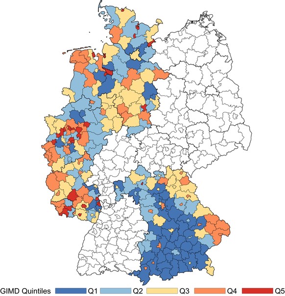 Die Bezirke wurden dabei je nach sozioökonomischem Status in fünf Quintile – also fünf Kategorien mit je der gleichen Anzahl an Einheiten – eingeteilt. Für die Berechnung dieses Status sind Faktoren wie Einkommen, Beschäftigungsquote, Ausbildung, Umwelt und Sicherheit entscheidend. Die höchste Kategorie ist dabei vor allem in Bayern präsent, während das schlechteste Quintil (Q5) im Saarland und im restlichen südlichen Westen Deutschlands prävalent ist. Die neuen Bundesländer (ehemals DDR) sowie Baden-Württemberg und Hessen waren mangels kompletter Datenlage nicht Teil der Untersuchung.
