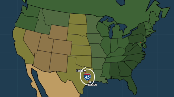 Die I-45 verläuft nicht durch mehrere Staaten, sondern nur durch Texas – und zwar von Galveston bei Houston bis Dallas. Für eine Haupt-Interstate (enden auf 0 und 5) ist sie mit einer Länge von 459 Kilometern auch ausgesprochen kurz.