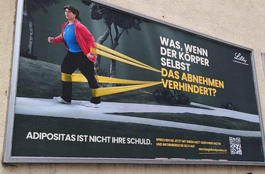 Dieses Sujet hängt derzeit an unzähligen Plakatwänden und an digitalen Werbesäulen, zum Beispiel am Zürcher Hauptbahnhof. Auf den ersten Blick könnte man es für eine Gesundheitskampagne einer offiziellen Stelle halten. Doch wer genauer hinschaut, entdeckt den Absender: Es ist der US-Pharmakonzern Eli Lilly, der auch hierzulande seine Abnehmspritze Mounjaro verkauft.