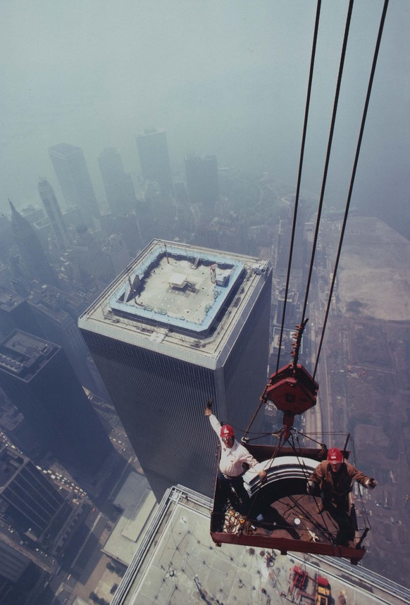 Stahlbauarbeiter posieren für ein Foto vor dem Nordturm des World Trade Centers.