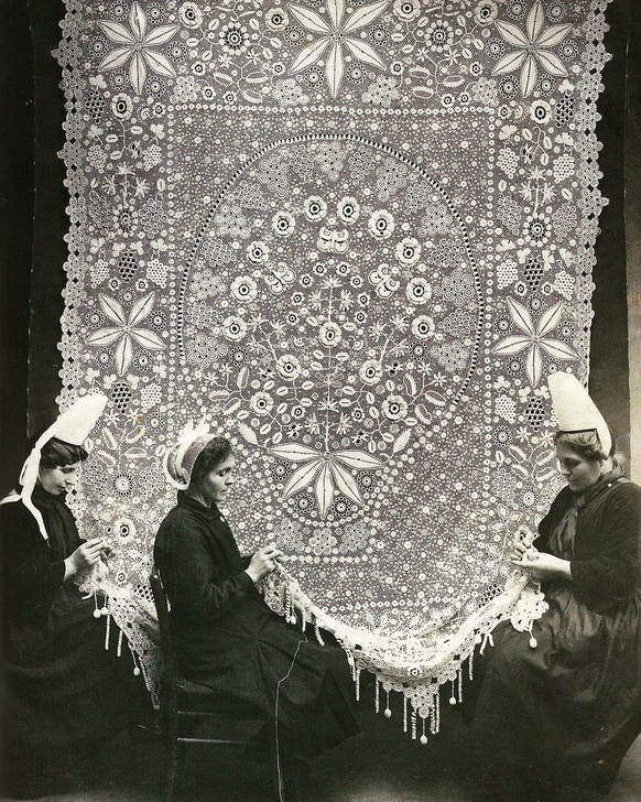 Mittels Klöppeln – spindelförmige, meist aus Holz gefertigte Spulen – und dem daran aufgewickelten Garn fertigen diese Damen Spitzen.