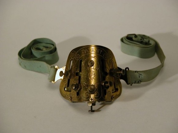 Dieser wurde 1894 patentiert und bestand aus einem gebogenen Messingblech, das mit zwei breiten Bändern am Kopf fixiert werden musste. Nun brauchte man die verschiedenen Schrauben nur noch wunschgemäss anzuziehen, auf dass das darunterliegende Lederkissen die fehlerhafte Nase zum griechisch-römischen Prachtsexemplar zurechtpresste.