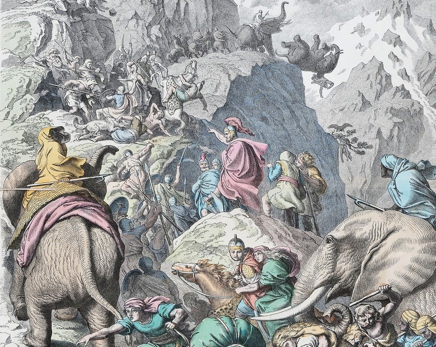Mit etwa 30'000 Soldaten, 15'000 Reitern und 37 Kriegselefanten zog er von der iberischen Halbinsel nach Italien. Der römische Feldherr Publius Cornelius Scipio versuchte vergeblich, ihn an der Rhone abzufangen. Und so zog Hannibal mit seinem Heer über die Alpen, um die Römer im eigenen Land zu schlagen.