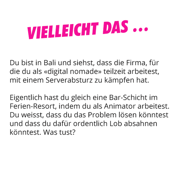 Und die Welt sagt im Gegenzug: Kommt drauf an, wie flexibel du bist! Kommt drauf an, wie hoch dein AQ, dein Adaptability Quotient ist. Denn darauf soll's in Zukunft ankommen, schaut man sich die Prognosen namhafter Wirtschaftsethnologen an. Die Intelligenz von morgen, heisst es, ist deine Flexibilität. Die Fähigkeit, sein Können an die Entwicklung anzupassen. Gefragt sind nicht mehr Einsteins, die im stillen Kämmerchen das Denken von Raum und Zeit auf den Kopf stellen, sondern Flipflops tragende Kreativköpfe, die an einem Tag als Social-Media-Manager ein Meme viral gehen lassen und am anderen eine Weiterbildung in Roboter-Programmierung besuchen.