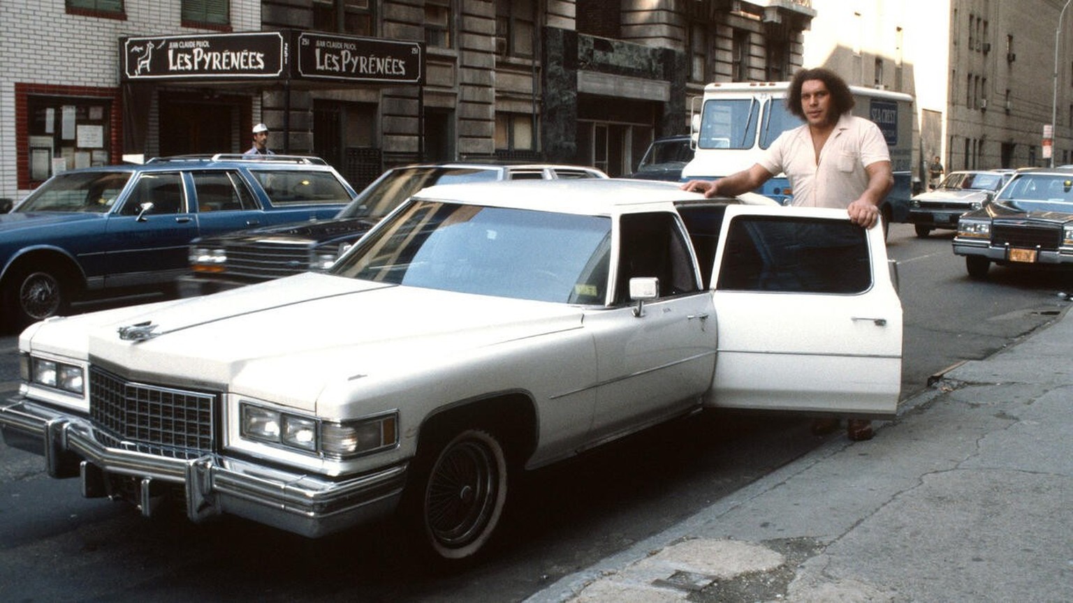 Der französische Profi-Wrestler André the Giant mit seiner Cadillac-Limousine, die dem «achten Weltwunder», wie er auch genannt wurde, eine einigermassen bequeme Fahrt ermöglichte. André litt an Riesenwuchs und Akromegalie, er war über zwei Meter gross und ca. 240 Kilogramm schwer.