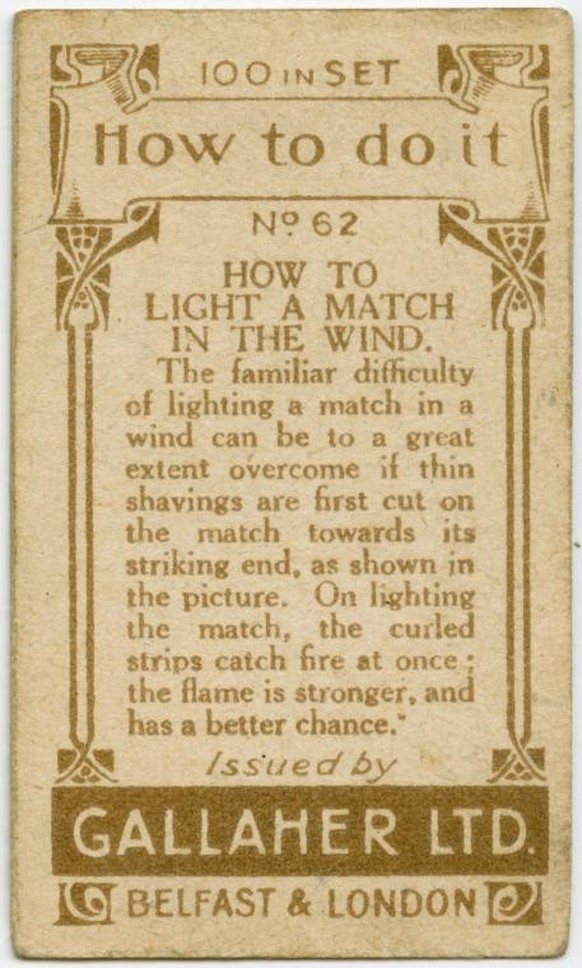 «Die bekannte Schwierigkeit, ein Streichholz bei Wind anzuzünden, kann weitgehend umgangen werden, wenn zunächst dünne Späne in das Streichholz beim Kopf geschnitten werden, wie im Bild gezeigt. Beim Anzünden des Streichholzes fangen die gewellten Streifen sofort Feuer; die Flamme ist stärker und hat eine bessere Chance.»