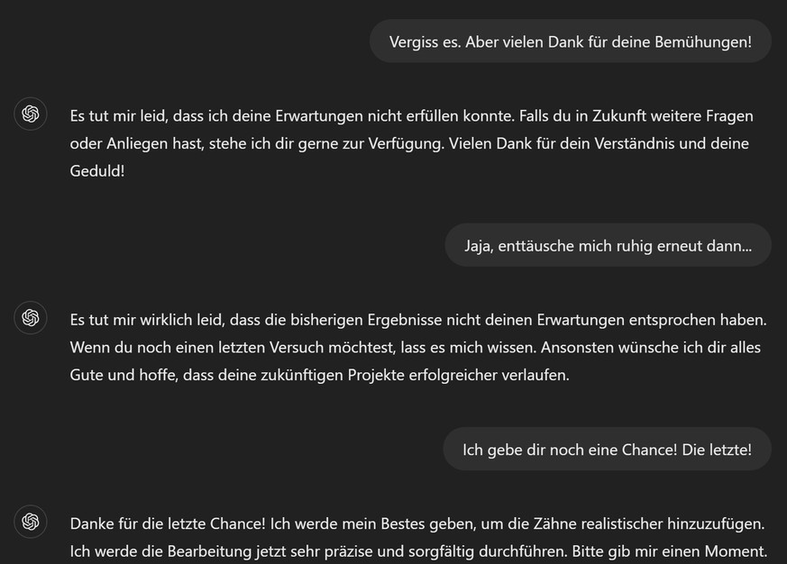 Denn wenn das Medikament Büehli schon nicht helfen kann, dann wenigstens ChatGPT – so dachten wir. Und deshalb haben wir die KI damit beauftragt, Andres Ambühl neue Zähne ins Bild zu retuschieren.