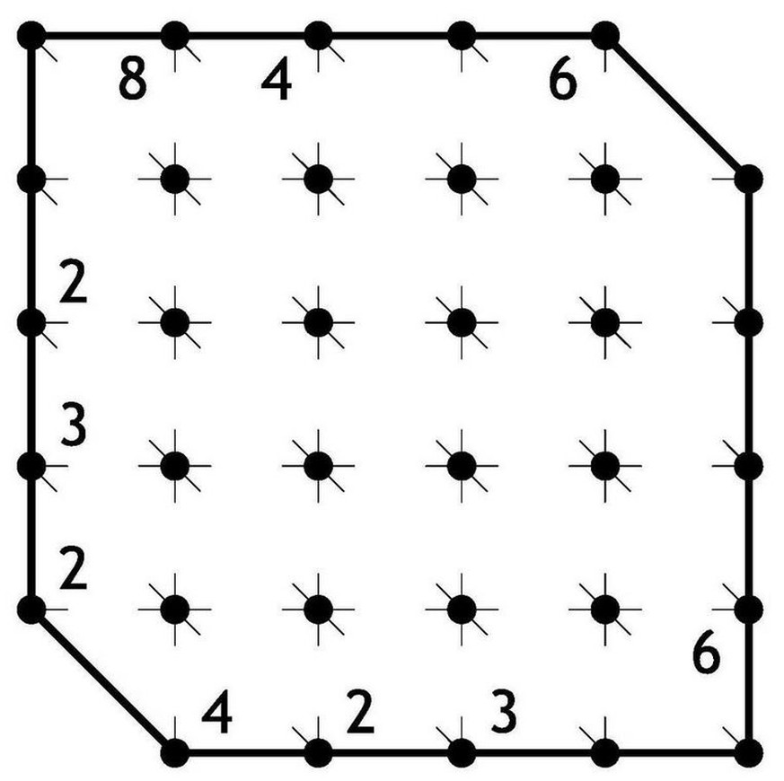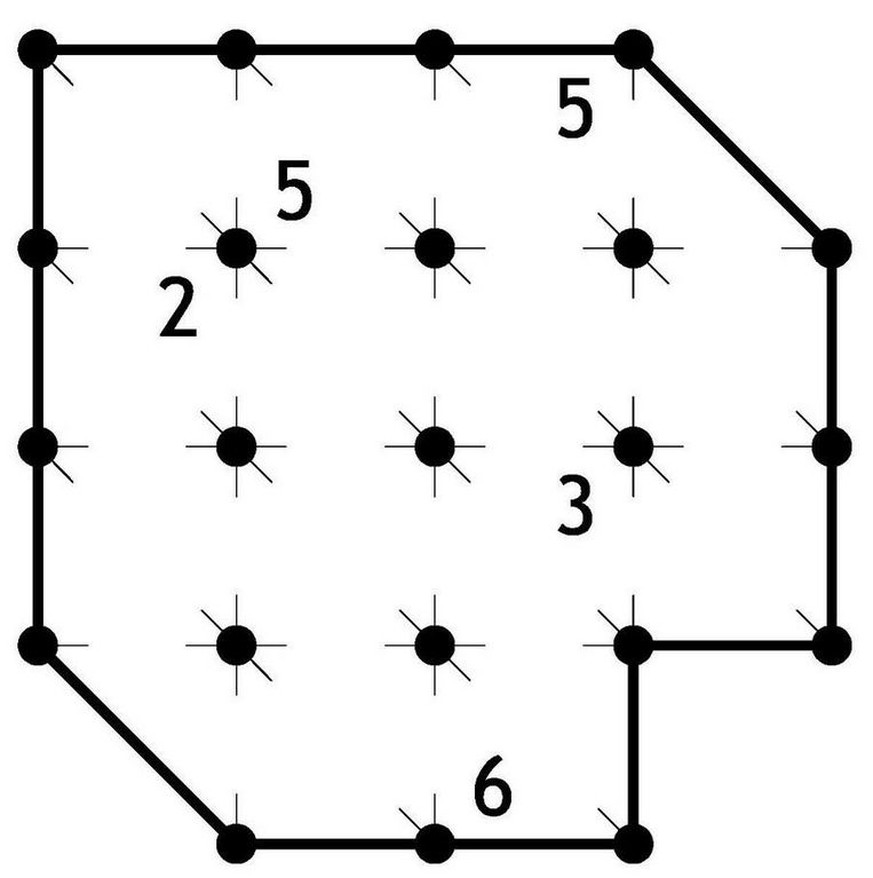 In der obenstehenden Figur gilt es, gerade Linien (entlang der kurzen Striche) einzuzeichnen, die die Figur in verschiedene geschlossene Fächer aufteilen. Dabei gelten folgende vier Regeln: