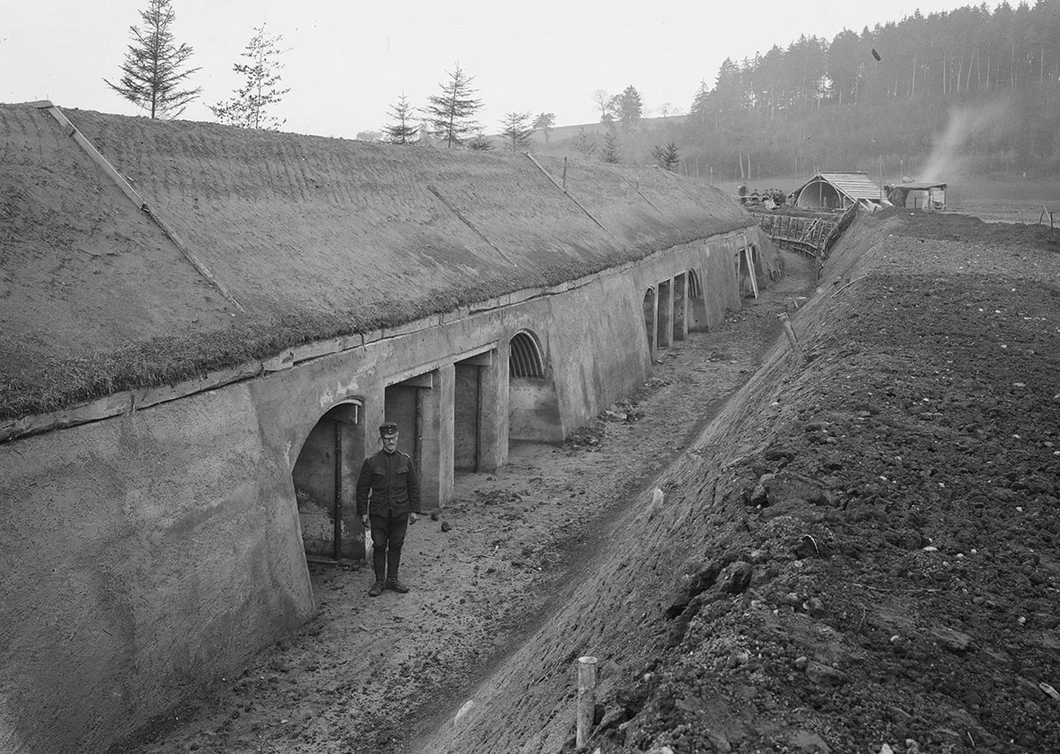 Beim Bau der Fortifikation Murten setzt die Armee 1914–1917 auf verstärkte Feldbefestigungen und Bunker. Der bis dahin sparsam eingesetzte Baustoff Beton nutzt man nun intensiv und baut in den ersten Kriegsmonaten Infanterie-Stützpunkte. Dies sind von Stacheldrahthindernissen umgebene Schützengrabensysteme in Halbkreisform. In der Kehle, der Rückseite eines Werkes, bieten betonierte Unterstände Schutz vor feindlichem Beschuss.