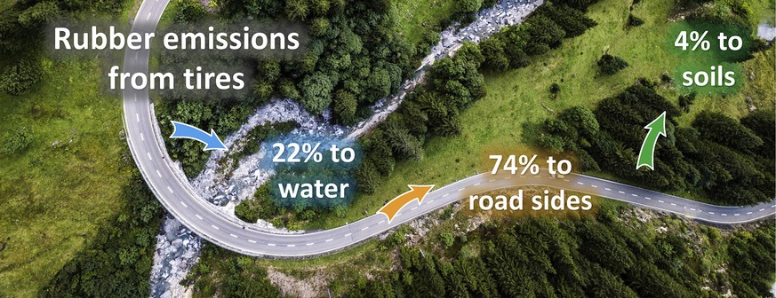 Das abgeriebene Gummi wirbelt zunächst durch die Luft und landet auf den Streifen rechts und links der Fahrbahn. Etwa drei Viertel der Gesamtmenge der Gummipartikel bleiben auf einem fünf Meter breiten Streifen abseits der Strasse, wie die Empa schrieb. Rund vier Prozent gelangen in die restlichen Böden, 22 Prozent landen in Gewässern.