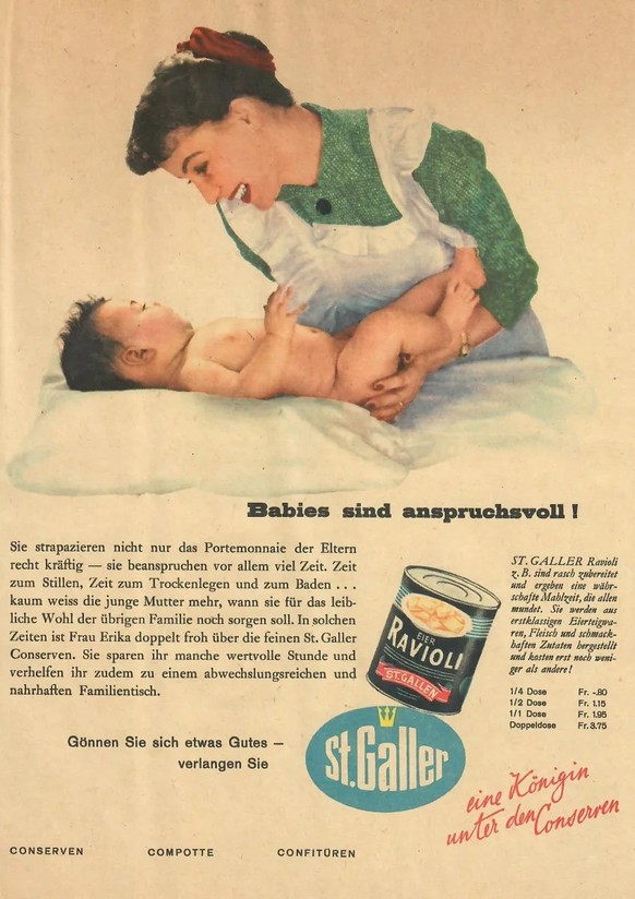 In der Werbung von 1954 kümmert sich Frau Erika gerade um ihr Neugeborenes. Sie lächelt das vor ihr liegende Kind glücklich an. Und dies, so verdeutlicht der Werbetext, obwohl die Säuglingspflege teuer und zeitintensiv ist. «kaum weiss die junge Mutter mehr, wann sie für das leibliche Wohl der übrigen Familie noch sorgen soll», heisst es. Die St. Galler Ravioli versprechen die Lösung: Die Hausfrau, die Frau Erika sinnbildlich verkörpert, spart dank Konservenkonsum Zeit für ihr Neugeborenes und kann ihre Familie trotzdem abwechslungsreich bekochen.