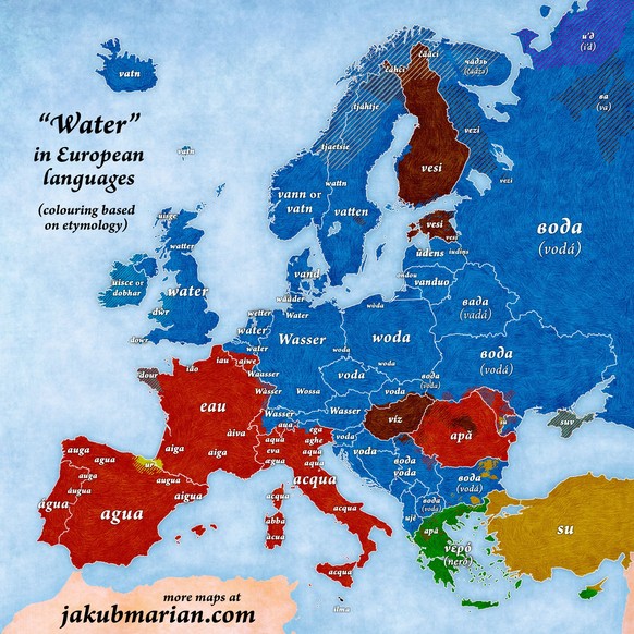 Das deutsche Wort Wasser hält sich etymologisch dagegen fast strikt an die Sprachgrenzen zwischen dem Germanischen und dem Romanischen. Wasser kommt vom indogermanischen Wort «wódr̥» oder «wédōr», das französische Eau vom lateinischen «Aqua».