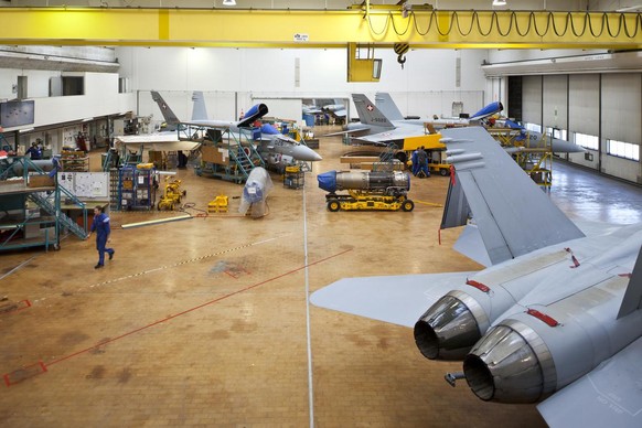 F/A-18 fighter jets of the Swiss Army stand in a hangar of RUAG Aviation in Emmen in the canton of Lucerne, Switzerland, for maintenance, pictured on February 7, 2011. (KEYSTONE/Gaetan Bally)