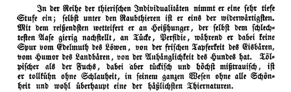 Dies kommt etwa in der sonst sehr objektiv wissenschaftlichen Beschreibung der Alpenfauna von Friedrich von Tschudi von 1860 zum Vorschein: Von Tschudi, ein hochgebildeter Schweizer Intellektueller und Naturschützer des 19. Jahrhunderts, der in den Glarner Alpen geboren und aufgewachsen war, liess am «Wolf» kein gutes Haar und beschrieb ihn hochemotional mit den übelsten Eigenschaften.
