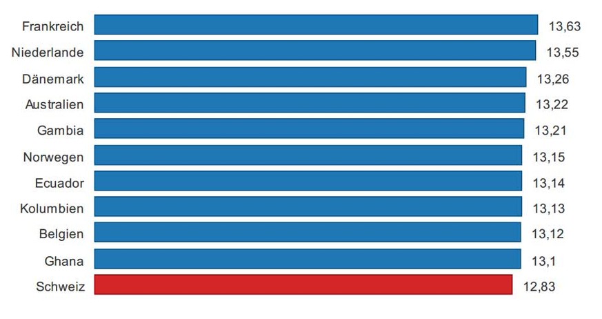 Wie die Liste unerbittlich zeigt, liegen die Schweizer Männer hinter sämtlichen Nachbarn – ausser Italien. Weltweit reichen ihre 14,35 cm für Rang 54, in Europa für Rang 15. Von unseren direkten Nachbarn sind die Österreicher klar am besten bestückt: 14,89 cm bedeuten weltweit Rang 39 und Platz 5 in Europa.