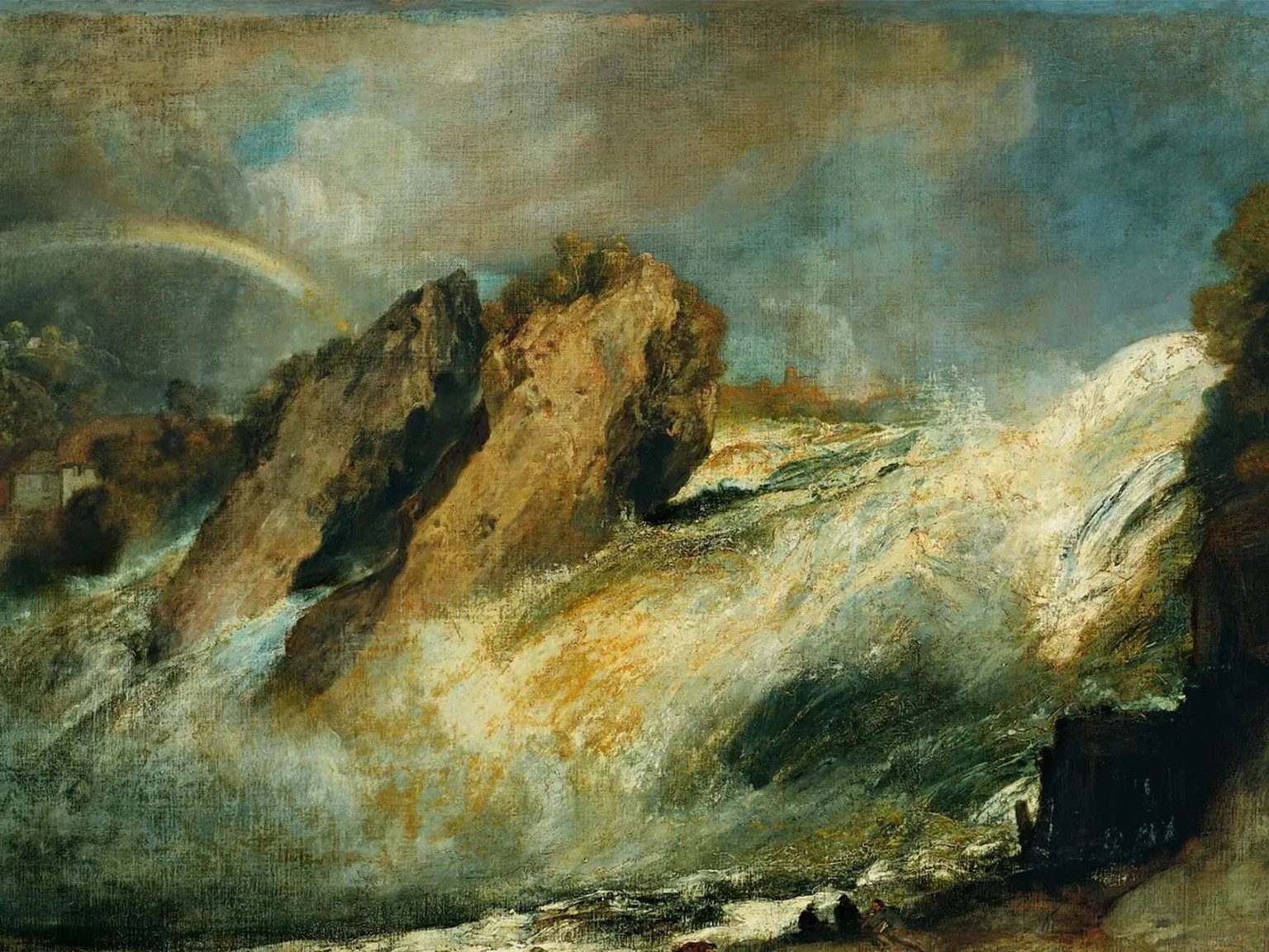 Eine herausragende Ausnahme ist das 1802 entstandene Gemälde des Rheinfalls bei Schaffhausen von William Turner (1775–1851). Joseph Mallord William Turner, wie der englische Maler mit vollem Namen heisst, richtet mit grosser Kelle an. Das Zentrum seiner grossformatigen Darstellung sind die herabstürzenden Wassermassen, die durch die Enge zwischen den Felsen hindurchbrechen. Ins Bedrohliche gesteigert wird der Eindruck durch die beiden Felsblöcke links, die demnächst ins Wasser zu kippen drohen.