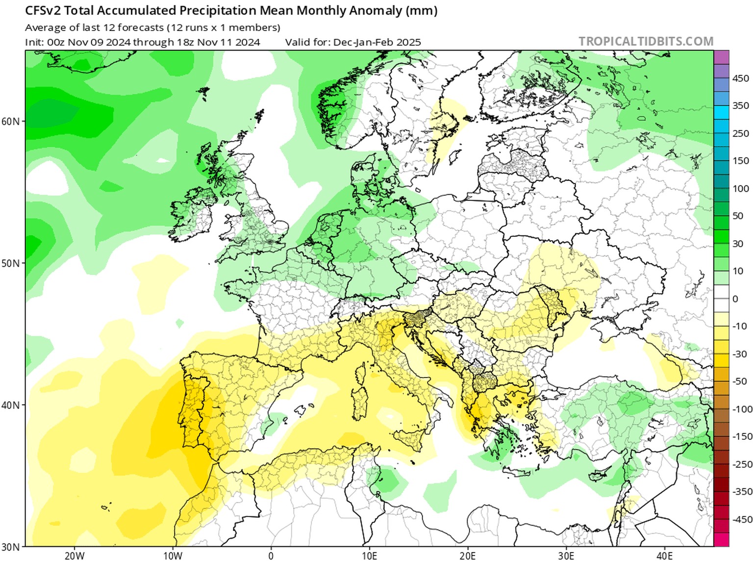 Diese Luftdruckverteilung dürfte Auswirkungen, besonders auf den Niederschlag, haben. Insbesondere das US-Modell, in Teilen aber auch das europäische, prognostizieren entsprechend relativ viel Niederschlag für den Norden Europas und relativ wenig für den Süden. Die Schweiz scheint sich gerade dazwischen zu befinden. Hier sieht es also in der Tendenz und Niederschlags-mässig nach einem durchschnittlichen Winter aus.